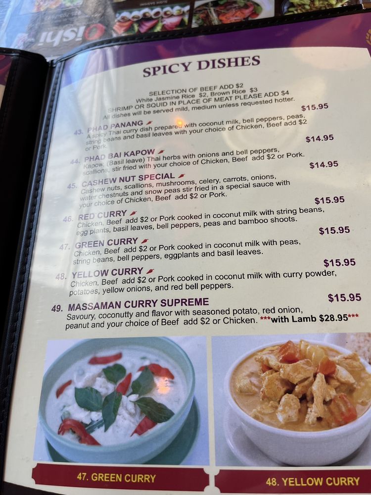 Hot. A spicy thai curry dish prepared with coconut milk, bell peppers, peas, string beans and basil leaves with your choice of chicken, beef or pork.