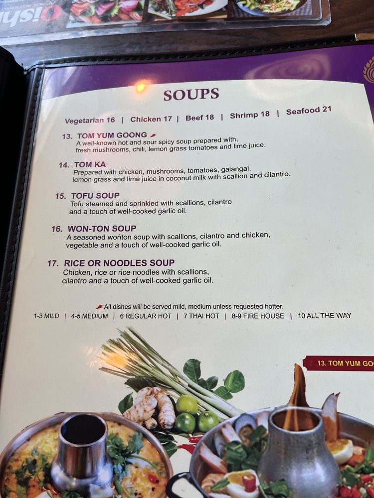 Prepared with chicken, mushrooms, tomatoes, galangal, lemon grass and lime juice in coconut milk with scallion and cilantro.